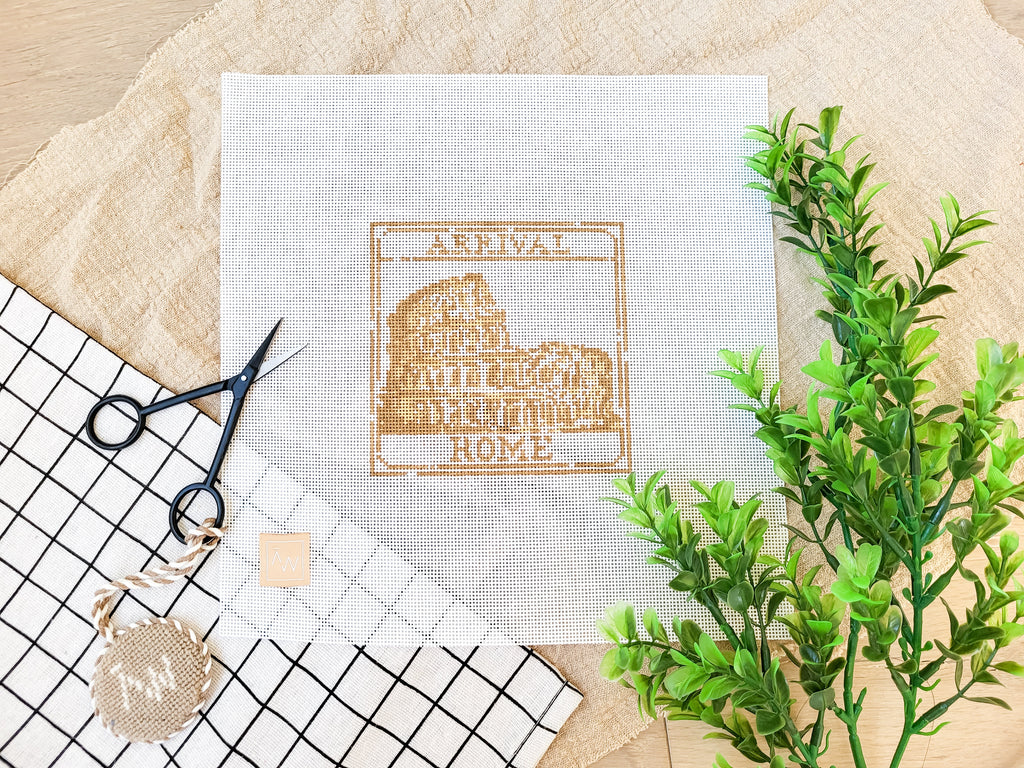 All canvases are stitch painted and come with a tapestry needle. This canvas does not come stitched or with fibers. Please allow 3-5 business days for in-stock canvases to ship.