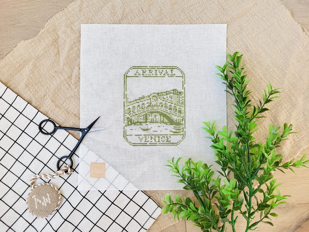 All canvases are stitch painted and come with a tapestry needle. This canvas does not come stitched or with fibers. Please allow 3-5 business days for in-stock canvases to ship.